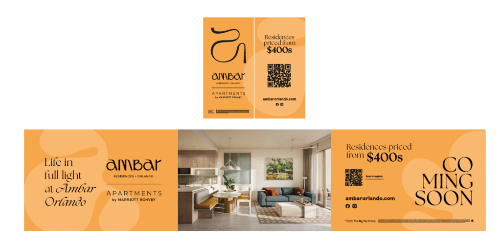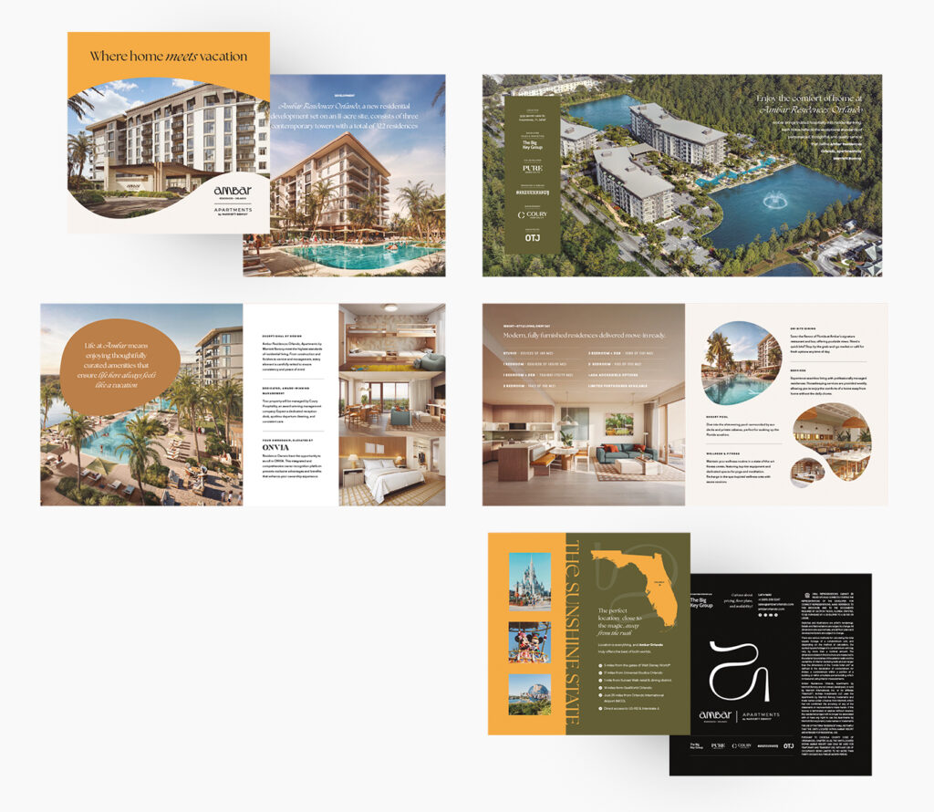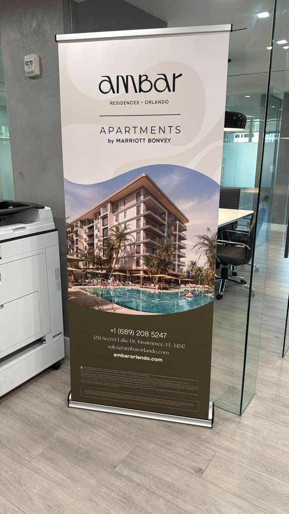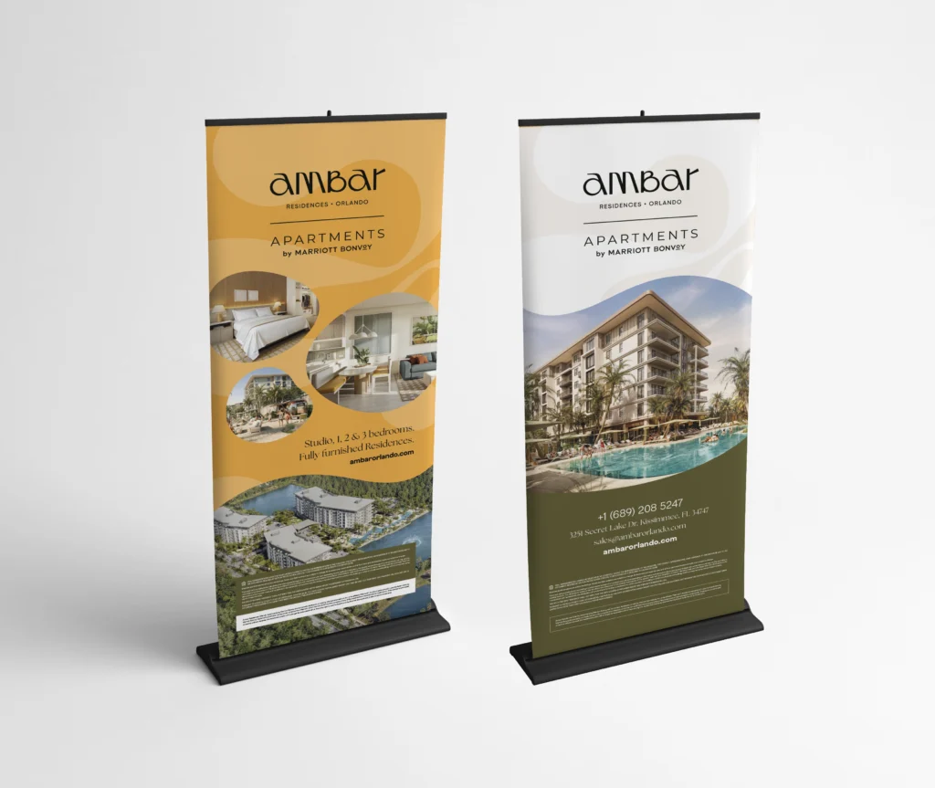 Además, desarrollé carpeta institucional y tarjeta personal listas para impresión (seleccionadas a partir de distintas propuestas presentadas), junto con cartelería para el frente del desarrollo en Orlando y banners para el sector de ventas, garantizando consistencia de marca en todos los puntos de contacto, tanto físicos como digitales.